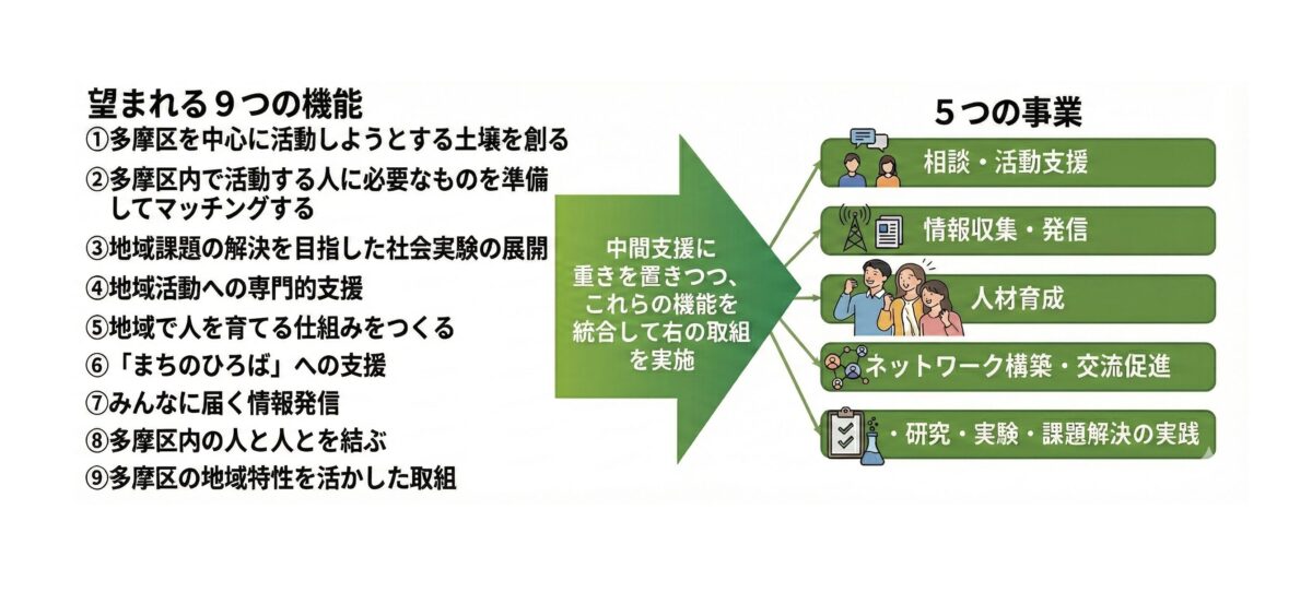 多摩SDCに望まれる9つの機能 1. 多摩区を中心に活動しようとする土壌を創る 地域づくりの担い手や社会起業家が生まれ、地域での活動がしやすくなるような環境づくりを SDC が主体的に企画・プロデュースして実施します。こうした取組を通じて、活動する人の夢の実現を様々な段階で積極的に支援し、豊かな地域社会を形成します。 2. 多摩区内で活動する人に必要なものを準備してマッチングする ヒト・モノ・カネといった地域活動をする上で必要なニーズに応じてきめ細やかに対応していくため、日頃から情報収集や地域、企業等との関係づくりに努め、必要とする人に必要とするモノ等を効果的にマッチングしていきます。 3. 地域課題の解決を目指した社会実験の展開 多摩区は、区内に 3 つの大学が立地し、知的資源・人的資源に恵まれた地域性があります。こうした大学や区内の企業等と地域の交流を一層促進しながら、双方の活性化につながる取組を進めるとともに、ひいては地域の課題解決につながるような社会実験等の取組を協働して展開していきます。また、必要に応じて近隣地域等とも連携していきます。 4. 地域活動への専門的支援 複雑・多様化する地域課題の解決に取り組む団体等に対して、的確・効果的な支援を行うために、専門家による助言や、知識・スキルを持つ人を発掘・募集し必要とする団体等に結びつける取組を行います。 5. 地域で人を育てる仕組みをつくる 高齢化の急速な進行や、地域課題の多様化等により、地域活動の担い手不足が懸念されています。多様な主体と多世代による支え合いのまちづくりを実践していくために、社会に貢献するという視点を持った人を、地域の中で育てる仕組みづくりを進めます。 6. 「まちのひろば」への支援 誰もが気軽に集える地域の居場所「まちのひろば」を、多様な地域資源を活用して新たに創出する活動に対して立上げ支援等を行います。また、既に地域に存在し、「まちのひろば」としての機能を果たしている様々な居場所(一例としてコミュニティカフェなど)について情報収集し、求められる支援(より多くの人に知ってもらうための広報、活動がより充実するような支援等)を行います。 7. みんなに届く情報発信 チラシ、広報紙など従来の紙媒体での情報発信に加えて、SNS などインターネットを通じた多様な手法を活用するなど、より多くの人が、より受け取りやすい形での情報発信を行います。また、本当に必要とする人に必要な情報を届けるための取組を行います。 8. 多摩区内の人と人とを結ぶ 区内で活動する団体同士の交流など、人と人との顔が見える関係づくりを進めることで、活動の活性化や豊かな地域コミュニティの形成を目指します。 9. 多摩区の地域特性を活かした取組 多摩川や二ヶ領用水などの水辺環境、生田緑地の豊かな自然環境や文化・教育施設など、豊かな地域資源に恵まれた多摩区ならではの取組を展開します。また、多摩川沿い平野部と多摩丘陵の丘陵地で、まちの成り立ちや地域の課題が大きく異なるといった、多摩区における地域の実情や特性に応じた取組を進めます。 9つの機能を活かす5つの事業 多摩SDCは、以上の9つの機能を、「中間支援」を中心としつつ、「相談・活動支援」「情報収集・発信」「人材育成」「ネットワーク構築・交流促進」「調査・研究・実験・課題解決の実践」という5つの事業を通して発揮していきます。