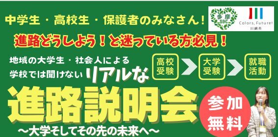 12月212025 12月21日(日) 学校では聞けない「リアルな進路説明会」を開催します この進路説明会は、現役の大学生、社会人が、受験で自らが経験したことや課題を克服する方法、高校および大学での過ごし方、社会人となって経験することなど、リアルな情報を、地元の中学生・高校生に伝える機会として、多摩SDCが2023年から開催しているものです。 大学入試だけでなく、就職やその先を見据えた内容を聞くことができる大学入試進路説明会です。 多摩区やその近隣で小~高校まで過ごした大学生を中心に、現在都内の上場企業で働く方がお話しします。地元の高校生・中学生・保護者のみなさんにぜひ聞いていただきたいです! 日時:12月21日(日) 〈中学の部〉未来を見据えた進路説明会 12:05~13:35 〈高校の部〉総合型選抜に向けた説明会 13:45~15:15 場所:麻生区役所4階(麻生区万福寺1-5-1) お申し込みはこちら↓