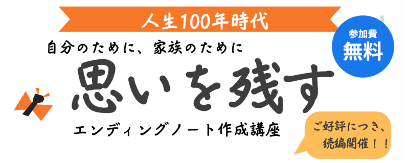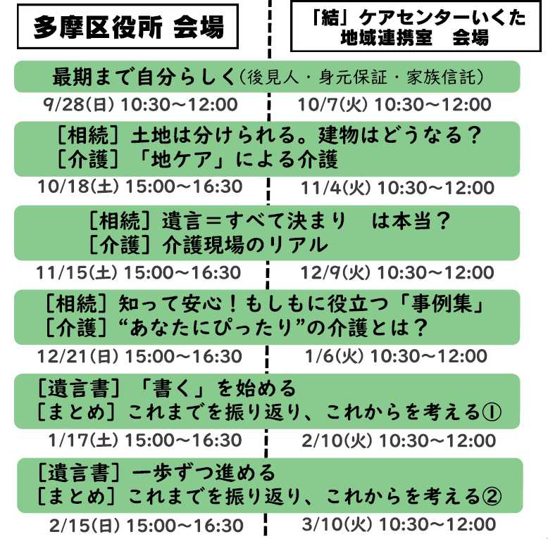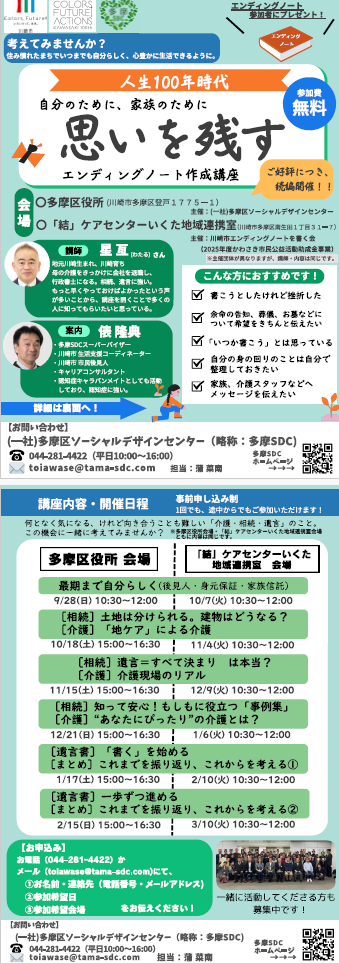 エンディングノート作成講座、好評につき続編開催! 2025.10.06 何となく気になる、けれど向き合うことも難しい 「介護・相続・遺言」のこと。この機会に一緒に考えてみませんか?住み慣れたまちでいつまでも、自分らしく、心豊かに生活できるように。 エンディングノート作成講座(全6回 事前申込制) 1回でも途中からでもご参加いただけます。参加費は無料です。 講師:星 亙(ほし わたる) 案内:俵 隆典(たわら たかのり) 会場1:多摩区役所 (一社)多摩区ソー シャルデザインセンター 主催 会場2:「結」ケアセンターいくた地域連携室 川崎市エンディングノ ー トを書く会 主催 ※主催団体が異なりますが、講師・内容は同じです。 内容と日程: 【お申込み】 お電話(044-281ー4422)かメール(toiawase@tama-sdc.com)にて、下記をお伝えください。 ① お名前・連絡先(電話番号・メールアドレス) ② 参加希望日 ③ 参加希望会場 【お問い合わせ】 (一社)多摩区ソーシャルデザインセンター(多摩SDC 担当:蒲 菜南) 044-281-4422(平日10:00~16:00) toiawase@tama-sdc.com チラシダウンロード Tweet シェア